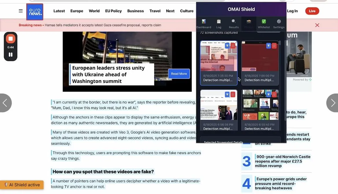 OMAI Shield is an AI safety and compliance tool that detects harmful, manipulative, or deceptive AI generated content in real time. It runs fully locally on your device, ensuring GDPR compliance and alignment with the EU AI Act.